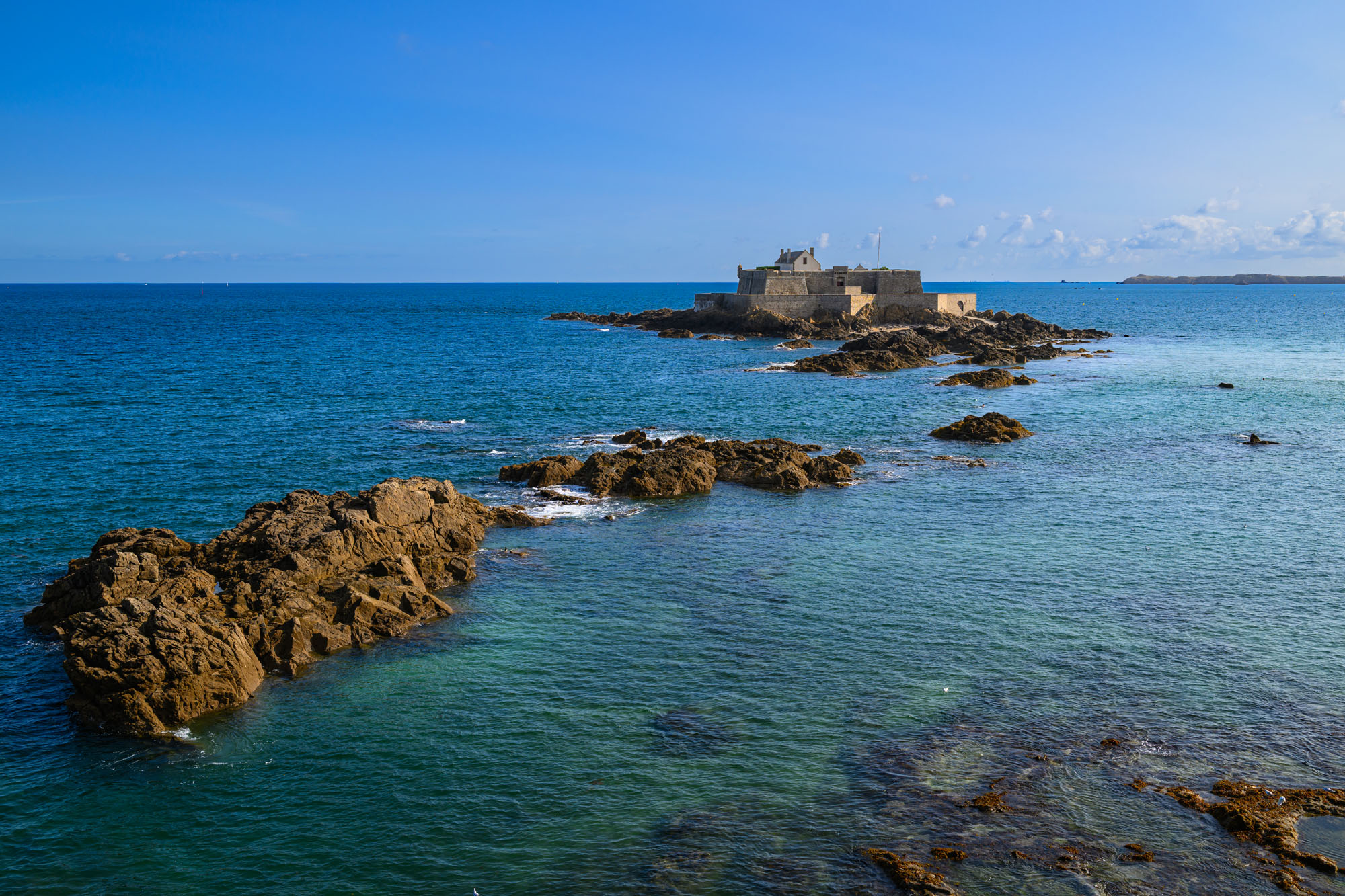 Saint-Malo, cinta da mura grigie che sfidavano un oceano placido, beneficiava ancora di quell’agosto avvolgente, invitando a scalare il Bastione Saint-Iréné senza affanno. Intra-muros, stradine acciottolate brulicavano di turisti in abiti estivi, e la statua di Surcouf indicava ostile l’Inghilterra sotto un cielo venato di nuvole soffici; dal parapetto, l’orizzonte selvaggio si perdeva in una foschia luminosa, e l’aria salmastra, tiepida al respiro, evocava le gesta corsare di Duguay-Trouin, velieri che solcavano mari sotto stelle augustee. In una taverna ombreggiata, un boccale di birra dissetò la mia sete di passato, legando il tepore esterno a quello interiore delle reminiscenze.